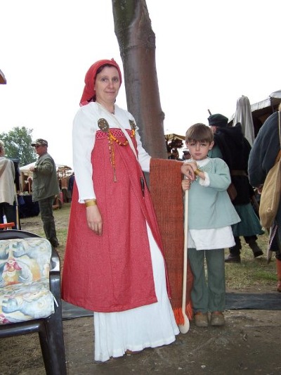 Das weiße, gefältelte Gewand ist nur eine "Notlösung". Ich war lange auf der Suche nach einem Gewebe, das fein war und zarte Falten hat. Schließlich bin ich dann fündig geworden, aber es ist ein feiner Viscose-Stoff. Den gab es so damals nicht, aber er sah ungefähr so aus, wie ein anhaftender Stoff-Fund auf einer der Birka-Fibeln. Mittlerweile habe ich einen ganz feinen, fast durchscheinenden Wollstoff gefunden, aber mir fehlt die Zeit, im gesamten Brustbereich eine Fältelung zu nähen. Das wird wohl wieder mal so ein Projekt für den langen Winter vor Freienfels werden ...