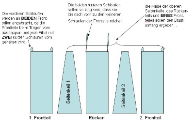 Daher sah ich ein Rückenteil und zwei trapezförmige Seitenteile vor. Den "Frontlappen" schnitt ich 2x zu und brachte jeweils an den Ecken zwei kleine Fadenlaschen für die Fibeln an. Hinten, in Höhe der Schulterblätter nähte ich zwei lange Fadenschlaufen fest, die die Schürze über den Schultern in Form halten.