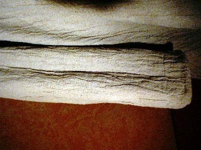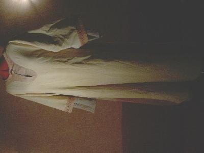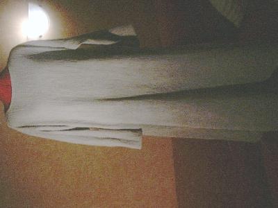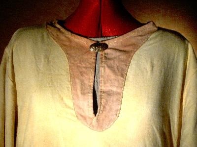 Beim Zuschneiden des gelben Lakens stellte ich dann fest, daß es zu wenig Stoff für ein komplettes Gewand war! Die gleiche Farbe und das gleiche Laken noch mal zu hinzubekommen war unmöglich, also nahm ich das andere Laken und machte die Geren aus diesem Stoff. Irgendwann nach wochenlanger Handnäherei war es dann schließlich fertig, mein Haus-kleid, das selbst der putzsüchtigsten Wikingerfrau Ehre macht. Oder?