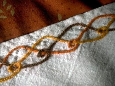 Ich kam auf die glorreiche Idee, ein Knotenfries statt einer Borte aufzusticken, da das schneller geht ... hätte ich DAS noch mal zu machen! Erst habe ich das Muster zwei Abende lang aufgemalt, dann das Muster eine Woche lang vierfarbig vorgestickt (das sieht man auf dem Bild links).